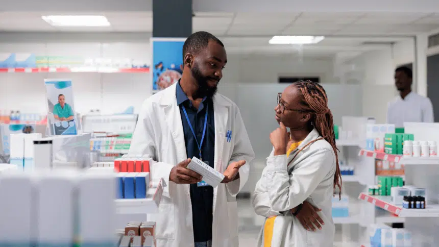 Pharmacist consulting with a patient in a hospital setting.